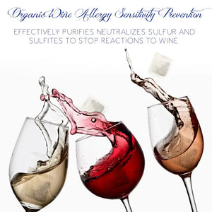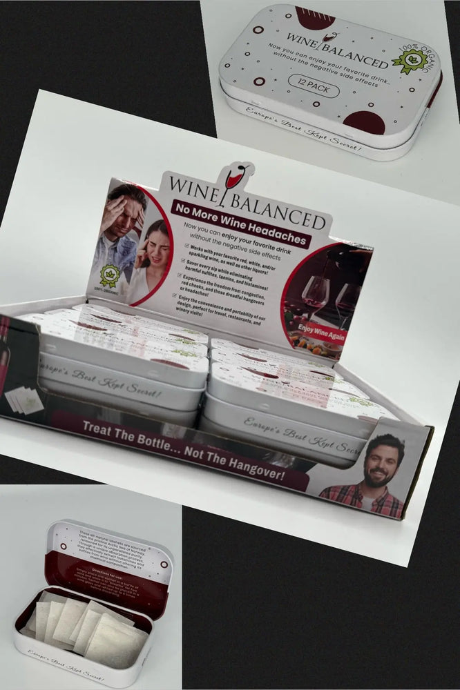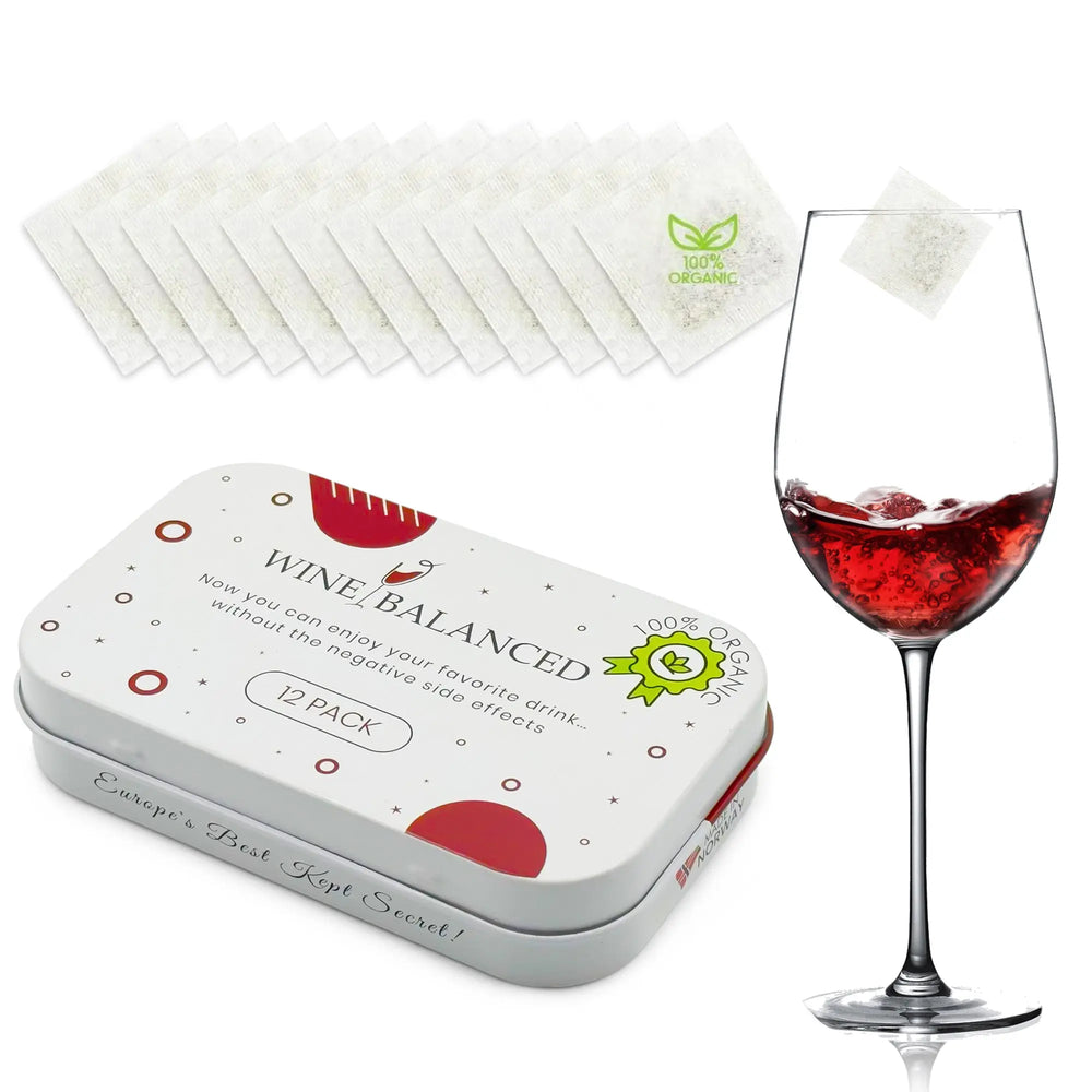 Wine Balanced eliminates wine headaches, itchy skin, and sweats using 100% natural coral algae filters from Norway's Arctic Sea. One sachet per glass works instantly for up to 6 refills or an entire bottle - without changing wine's flavor.